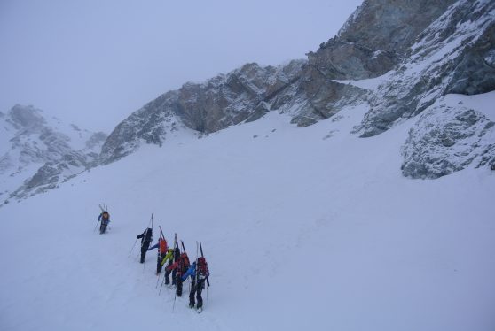 この日の行程はロング。ビニエット小屋からエベックのコルへの登高にかかる前に一旦、スキー滑走。硬い斜面のトラバースをへて、プチパウダーを滑走して氷河のプラトーでシール装着。シール登高でエベックのコルを目指します。視界がイマイチな分、黙々と登ります。